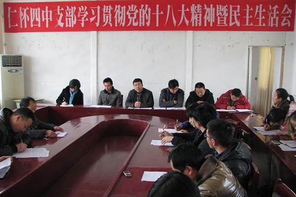 2012年12月11日,仁懷四中黨支部召開學(xué)習(xí)貫徹黨的十八大精神暨民主生活會。會議組織學(xué)習(xí)《十八大報告中有關(guān)教育的論述》、《十八大報告新思想新觀點新提法》等文章,在隨后的民主生活會中,會議組織全體黨員做了民主測評,并對黨員雙晉工作及近期黨建工作做了安排。