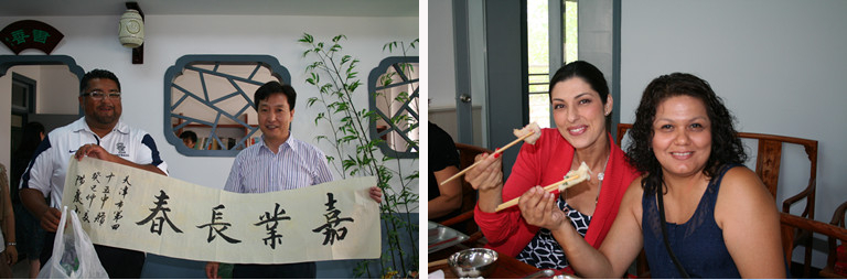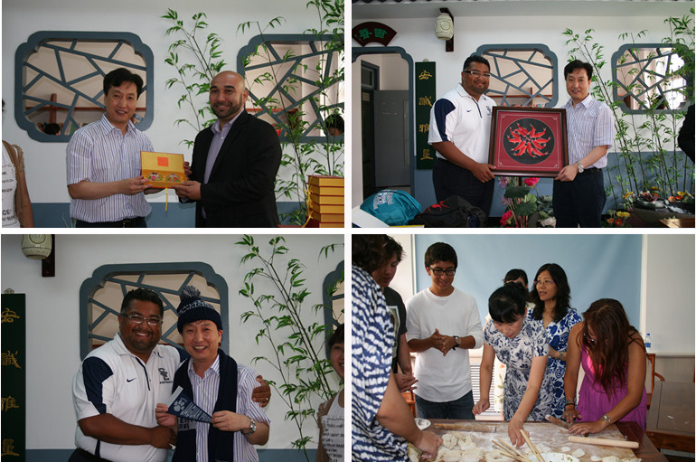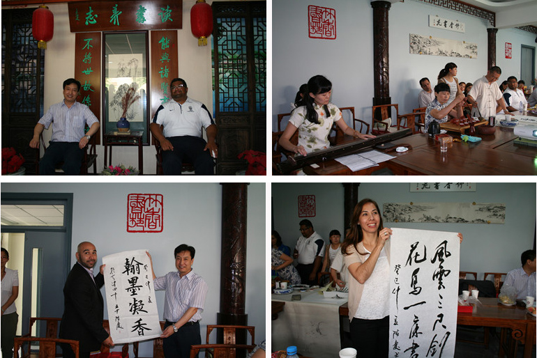 我校校長(zhǎng)鄭若興和書記王金義在達(dá)信樓二樓竹香書苑親切會(huì)見了訪問(wèn)團(tuán)一行。鄭校長(zhǎng)首先對(duì)訪問(wèn)團(tuán)來(lái)訪表示歡迎,他向客人簡(jiǎn)要介紹了我校歷史沿革、發(fā)展現(xiàn)狀、幸福教育學(xué)校特色以及國(guó)際合作與交流等方面的情況,并對(duì)訪問(wèn)團(tuán)為兩校間友好合作做出的努力表示感謝。鄭校長(zhǎng)表示,四十五中學(xué)一直以來(lái)都致力于對(duì)外合作與交流,為推進(jìn)學(xué)校國(guó)際化營(yíng)造良好的氛圍。鄭校長(zhǎng)向來(lái)訪團(tuán)介紹了我校已連續(xù)兩年接待外籍學(xué)生、并已在蘇格蘭開設(shè)孔子課堂三年了。介紹完學(xué)校情況以后,是我校幸福課程的課程展示,胡階慶老師的《書法藝術(shù)》、李彥琴老師《中國(guó)茶藝》和李玥玖老師的《古琴雅韻》都引起了來(lái)訪團(tuán)成員的極大關(guān)注,這一環(huán)節(jié)把整個(gè)活動(dòng)推向了一個(gè)高潮。接下來(lái)時(shí)兩名教師的讀書交流匯報(bào),第五學(xué)區(qū)代表團(tuán)成員和我校匯報(bào)的老師積極互動(dòng),共同探討讀書感悟。中午,我校師生和第五學(xué)區(qū)來(lái)訪團(tuán)成員一起包餃子、吃餃子,讓他們感受中國(guó)傳統(tǒng)的飲食文化。第五學(xué)區(qū)代表團(tuán)對(duì)我校的熱情接待表示感謝,并希望以此為契機(jī),進(jìn)一步加強(qiáng)雙方間的合作與交流。