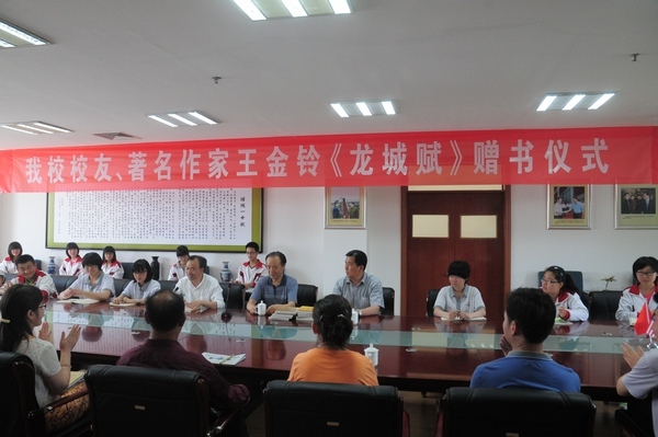 5月23日,我校舉行著名作家王金鈴《龍城賦》贈書儀式,王克田校長、邱昌茂副校長、部分語文教師和學(xué)生代表出席了贈書儀式。