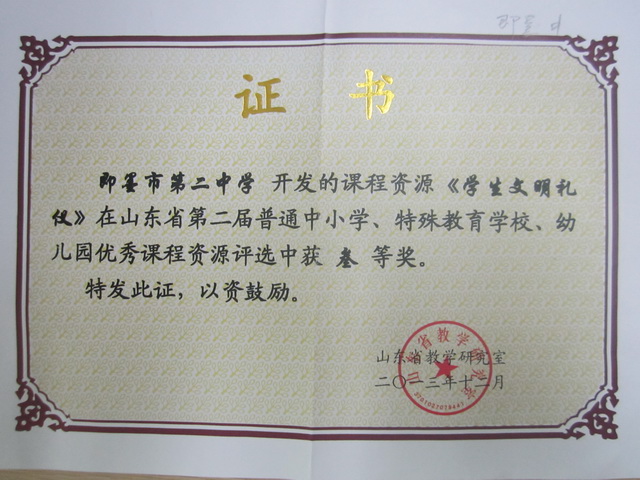 我校開發(fā)的課程資源《學(xué)生文明禮儀》在山東省第二屆普通中小學(xué)、特殊教育學(xué)校、幼兒園優(yōu)秀資源評選中獲三等獎。