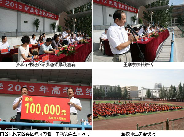 升國(guó)旗、奏唱國(guó)歌后,張書記向大會(huì)介紹了各位領(lǐng)導(dǎo)、來賓,隨后王學(xué)東校長(zhǎng)講話,對(duì)2013年高考進(jìn)行總結(jié)。白繼文副區(qū)長(zhǎng)代表東河區(qū)委、區(qū)政府向包頭一中頒發(fā)10萬元獎(jiǎng)金,楊婕副校長(zhǎng)宣布包頭一中2013年高考表彰決定。