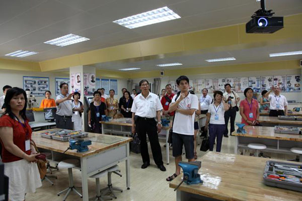 華校校長(zhǎng)們首先來(lái)到山東師大附中音樂(lè)教室,正在排練的附中交響樂(lè)團(tuán)(即山東省中學(xué)生交響樂(lè)團(tuán))的同學(xué)們?yōu)榧钨e現(xiàn)場(chǎng)演奏了激揚(yáng)奔放的《熱巴舞曲》和《長(zhǎng)江之歌》,贏得陣陣掌聲。在聽(tīng)到附中交響樂(lè)團(tuán)將于今年8月份應(yīng)邀到奧地利維也納金色大廳進(jìn)行演出,嘉賓們更是豎起了大拇指。校長(zhǎng)們又先后參觀了附中智能自動(dòng)錄播教室、通用技術(shù)教室和物理數(shù)字實(shí)驗(yàn)室,認(rèn)真傾聽(tīng)了各教室負(fù)責(zé)教師的講解,饒有興致的觀摩了同學(xué)們的通用技術(shù)課作品,還不時(shí)提出各種感興趣的問(wèn)題。