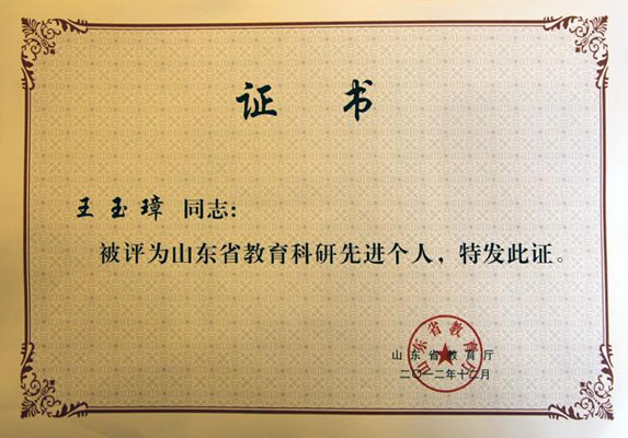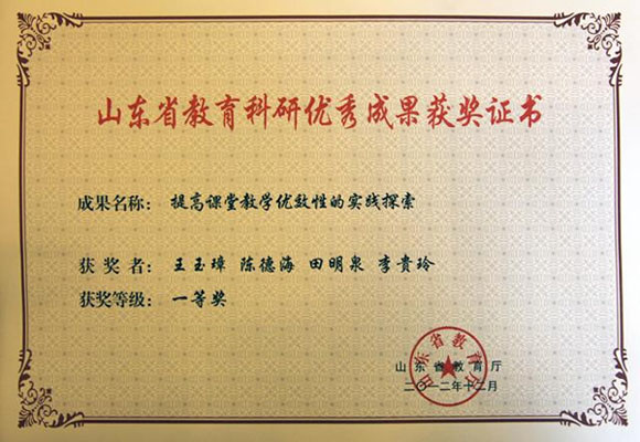 2013年5月23日至24日,山東省第五屆教育科研工作會(huì)議在青島市隆重召開。山東師大附中校長王玉璋被評為“山東省教育科研先進(jìn)個(gè)人”,由王玉璋、陳德海、田明泉等人共同完成的《提高課堂教學(xué)優(yōu)效性的實(shí)踐探索》研究報(bào)告被評為“山東省第五屆教育科研優(yōu)秀成果一等獎(jiǎng)”。