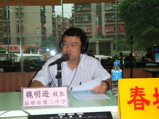 2009年6月23日(周二)早晨7點10分至8點,昆明市第三中學(xué)校長---魏明遜走進(jìn)了《春城熱線》直播間,就昆明市第三中學(xué)的師德師風(fēng)建設(shè)、教育教學(xué)質(zhì)量、學(xué)生素質(zhì)教育、招生計劃、學(xué)科建設(shè)等問題與聽眾朋友們進(jìn)行了對話交流。