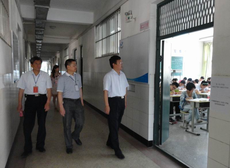 2014年安徽省普通高中學(xué)業(yè)水平考試順利進(jìn)行中,6月23日上午9時(shí)許,市教育局葛局長(zhǎng)、省教育廳巡視員段主任和市教研室王主任等一行分別來到四中考點(diǎn)進(jìn)行巡視。在考點(diǎn)內(nèi),謝校長(zhǎng)和郭書記陪同巡視。