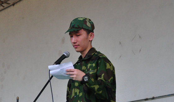 開營儀式上,黨委副書記、副校長潘向英代表學(xué)校致辭,她希望同學(xué)們發(fā)揚不怕苦、不怕累的軍人的品質(zhì),在五天的軍訓(xùn)時間中展示二高學(xué)生的風(fēng)采。承擔(dān)此次軍訓(xùn)任務(wù)的溫州軍分區(qū)海防營排長王燁代表全體教官講話,他以軍人的標準向在場所有高一新生提出了軍訓(xùn)要求:不畏艱苦,堅持到底。高一(2)班學(xué)生劉星宇代表全體高一新生發(fā)言,表示將牢記教官的要求,不辜負學(xué)校和老師的期望,在軍訓(xùn)中錘煉品格,盡快學(xué)會適應(yīng)、學(xué)會獨立、學(xué)會合作、學(xué)會思考,做一名真正合格的二高學(xué)子。