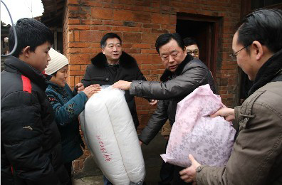 在廟前鎮(zhèn)煙集村文龍家里,兩間低矮的簡(jiǎn)易瓦房,多年失修,漏雨、潮濕,房間連房門(mén)都沒(méi)有一塊,但是墻上貼滿了獎(jiǎng)狀。當(dāng)陽(yáng)一中校長(zhǎng)徐家森將慰問(wèn)金2000元及自己購(gòu)買(mǎi)的棉被交到文龍母親文世俊手里。宋萬(wàn)明將準(zhǔn)備的年貨:2袋大米、2壺油、一袋豬肉悄悄放在灶臺(tái)旁。李國(guó)兵現(xiàn)場(chǎng)捐款2000元。