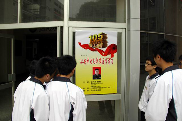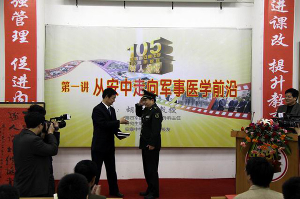 4月10日下午2時,安康中學(xué)階梯教室座無虛席,會場內(nèi)不時傳來陣陣掌聲。學(xué)校500余名師生在這里聆聽了第四軍醫(yī)大學(xué)口腔外科主任、安中80屆校友胡開進教授題為《從安中走向軍事醫(yī)學(xué)前沿》的專題報告。至此拉開了安康中學(xué)建校105周年系列慶典活動--“樹人講壇”的序幕。