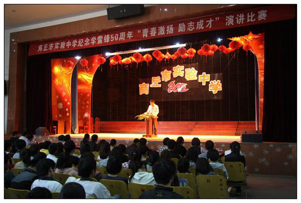 2012年4月26下午,商丘市實驗中學(xué)三樓禮堂掌聲雷動,喝彩不斷。由校團委主辦、高一年級承辦的紀(jì)念學(xué)雷鋒50周年“青春激揚、勵志成才”演講比賽決賽正在這里隆重舉行。學(xué)校楊典臻校長、武月書記等領(lǐng)導(dǎo)出席了本次比賽;