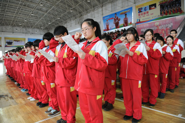 “喚醒所有的潛能,凝聚全部的力量;用拼搏換取理想,憑奮斗鑄就希望;我們將把驕傲奉獻給父母和師長,我們將把捷報頻傳給學校和四方!”……言辭鏗鏘、慷慨激昂。激情四射的全體學生的誓言與教師的誓言匯成一組交響曲,久久回蕩在場的每個人的心中,振奮的、感人的熱烈的場面使人永志難忘……