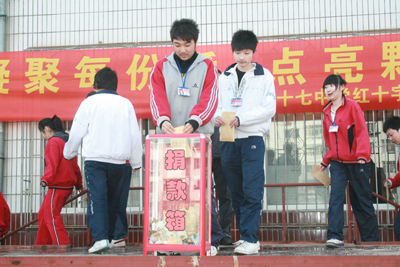 在捐款儀式上,首先由十七中學(xué)紅十字會(huì)副會(huì)長(zhǎng)楊雨校長(zhǎng)代表“十七中學(xué)紅十字會(huì)”向全校師生發(fā)出了助學(xué)捐款倡議,接下來(lái)分別由教師代表和學(xué)生會(huì)全體同學(xué)上臺(tái)捐款并發(fā)出倡議。在《和你一樣》的感人歌聲中,全校各班的學(xué)生代表都紛紛上臺(tái)捐款。此次活動(dòng)共募集捐款15320.1元,這些捐款將由十七中學(xué)紅十字會(huì)用來(lái)幫助校內(nèi)一些家庭存在特殊困難的同學(xué)完成高中學(xué)業(yè)。