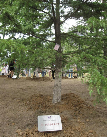 當(dāng)天下午,與會中學(xué)校長參加了南大舉辦的“共育桃李林”植樹活動,姚天勇在南大仙林校區(qū)圖書館旁親手種下代表南通中學(xué)的一棵雪松。上圖是姚天勇與一起種植“通中雪松”的南大一年級的我校部分校友,松樹旁刻有我校校名的南大110周年校慶紀(jì)念銘牌見證了植樹活動。下圖松樹上掛的號牌編碼為C24。