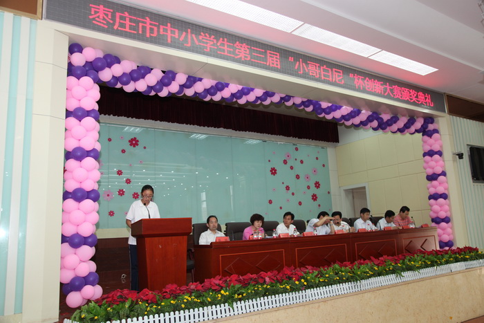 本次大賽共收到小發(fā)明、小創(chuàng)造、小制作、小課題研究、社區(qū)實踐和科幻畫等各類參選作品 523件。共評出一等獎175個,二等獎249個,三等獎99個,優(yōu)秀輔導獎424個,優(yōu)秀組織獎44個。我校十七件作品中彭碩的《未來世界》、殷嘉駿的《紙藝花》、李珂瑤的《懶人花事》、宋佳蕊的《爭當綠色小衛(wèi)士》等近十件作品在本次比賽中獲得一等獎的好成績。我校劉艷萍、劉崇麗、孔翔等近十七位教師獲得優(yōu)秀輔導教師獎。我校榮獲棗莊市第三屆中小學生“小哥白尼”杯創(chuàng)新大賽優(yōu)秀組織獎。我校孫飛校長、獲獎學生代表在頒獎典禮中領取了獎牌及證書,我校八年級徐曉睿同學代表獲獎學生在大會發(fā)言。
