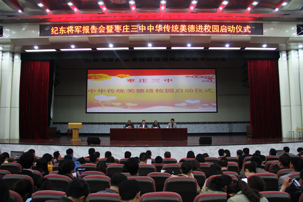 2014年4 月18 日,為扎實(shí)開(kāi)展好黨的群眾路線(xiàn)教育實(shí)踐活動(dòng),提高黨員干部的思想政治素質(zhì),強(qiáng)化黨性修養(yǎng),轉(zhuǎn)變工作作風(fēng),棗莊三中舉辦黨的群眾路線(xiàn)教育實(shí)踐活動(dòng)專(zhuān)題報(bào)告會(huì)。原武警指揮學(xué)院副院長(zhǎng)、周恩來(lái)鄧穎超研究中心顧問(wèn)、周總理生前秘書(shū)紀(jì)東少將應(yīng)學(xué)校邀請(qǐng),在三中西校報(bào)告廳為800 余名師生作了題為“弘揚(yáng)周總理精神風(fēng)范,樹(shù)立正確的人生價(jià)值觀(guān)” 專(zhuān)題報(bào)告。