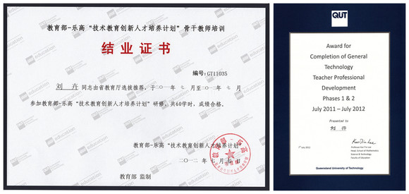 劉卉老師順利通過成果驗(yàn)收,獲得由教育部頒發(fā)的項(xiàng)目結(jié)業(yè)證書,以及由澳大利亞昆士蘭科技大學(xué)頒發(fā)的通用技術(shù)教師職業(yè)發(fā)展培訓(xùn)合格證書。
