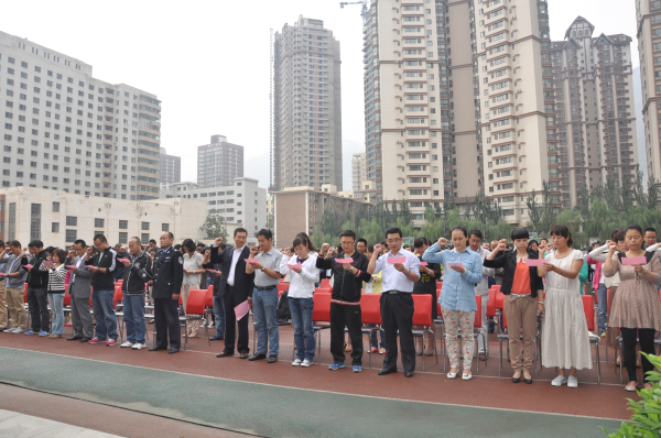 9點(diǎn)25分,在莊嚴(yán)的國歌聲中,大會正式開始。隨后,在莊嚴(yán)的五星紅旗下,全體教師莊嚴(yán)宣誓。