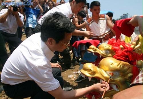 此時(shí),烏江兩岸禮炮齊鳴,人聲鼎沸。萬(wàn)眾矚目中,胡洪成、冉亞江等縣領(lǐng)導(dǎo)共同為龍舟“點(diǎn)睛”。