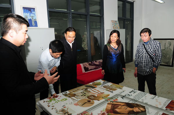 張真校長(zhǎng)等學(xué)校領(lǐng)導(dǎo)參觀美院,圖為參觀美院印染教室