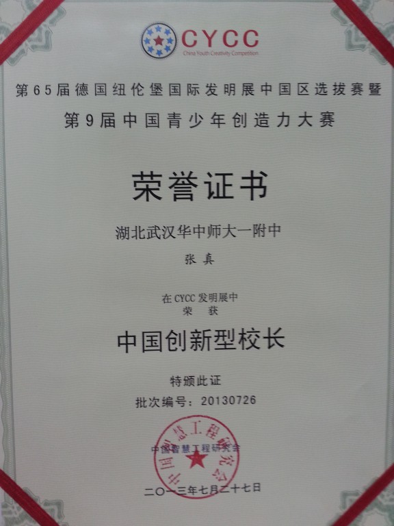 最后,華師一附中在“第65屆德國紐倫堡國際發(fā)明展中國區(qū)選拔賽暨第9屆中國青少年創(chuàng)造力CYCC大賽”總決賽上,以20枚金牌、1枚銀牌、2枚銅牌,23枚獎牌總數(shù)獲得團體金獎、2013年創(chuàng)新性學校,張真校長、胡焰坤副校長榮獲“中國創(chuàng)新型校長”。