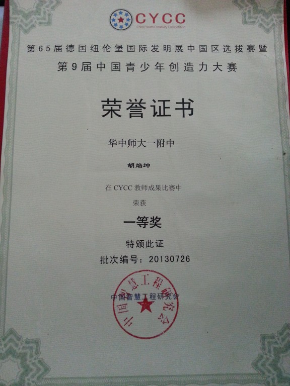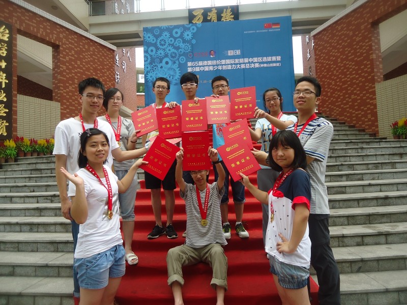 國家教育部于2011年發(fā)出通知,從2013年起在全國青少年科技競賽活動中,獲得獎勵的學生將不再享有高等學校招生的保送資格。從那時起,華師一附中校長張真明確指示,要開展新政策、新形勢下的科技教育工作的研究,提出要將“堅持能力培養(yǎng)為重,優(yōu)化知識結構,豐富社會實踐,強化能力培養(yǎng)”的中國教育的戰(zhàn)略目標與華師一“自主創(chuàng)新學習,多元優(yōu)質(zhì)發(fā)展”的學校特色建設目標相結合,扎實開展更多形式、活潑多樣、興趣與專注相結合、科研與實踐素養(yǎng)同步發(fā)展的普及型科技教育實踐活動。為此,在2012年以胡焰坤副校長、陶濤主任為正負課題組長的科研課題《基于創(chuàng)造力傳遞的學生創(chuàng)新素質(zhì)實訓技法研究》獲得張真校長的批準立項,得到楊國紅副校長和余國主任大力支持和指導,并于2012年10月15日獲得教育部人文社會科學研究規(guī)劃基金項目《影響中小學生創(chuàng)造力發(fā)展的個體、環(huán)境因素及其作用機制的縱向研究》總課題的批準(教育部項目批準號: 12YJA190024-142),成為創(chuàng)造力課題實驗學校,課題組的核心成員萬新華、李建國老師更是結合技術課程,立足課堂、延伸課外,將技術知識、技能培養(yǎng)與學生實踐素養(yǎng)發(fā)展相結合,開展學生創(chuàng)造力傳遞與科技實踐能力發(fā)展模式研究,與香港佛教孔先洲紀念中學師生進行跨境交流和研討 。2013年3月胡焰坤副校長親率萬新華、李建國老師參與“第65屆德國紐倫堡國際發(fā)明展中國區(qū)選拔賽暨第9屆中國青少年創(chuàng)造力大賽CYCC項目發(fā)布會,同時參與教育部“創(chuàng)造力研究”課題論壇”,CYCC大賽活動有12個大的項目,分別是學生發(fā)明項目展、定向發(fā)明設計與制作、電動折紙飛機制作與飛行、自制雞蛋撞地球投擲裝置、自制水火箭定向發(fā)射、環(huán)保海報和環(huán)保校旗創(chuàng)意設計、記憶力大賽、報紙時裝創(chuàng)意秀、結構設計等學生喜聞樂見,興趣與專注結合,發(fā)明設計與技能制作同堂競技,都能很好體現(xiàn)學生創(chuàng)造力,特別是能夠促進學生自我實現(xiàn)的科技大賽。因而,學?,F(xiàn)代教育技術處認真策劃和部署,結合華師一科技節(jié)的傳統(tǒng)的經(jīng)典活動項目,發(fā)布了“CYCC創(chuàng)造力大賽華師一實施方案”,讓科技節(jié)呈現(xiàn)出指導老師個人定向掛鉤與年級級部的“點面”落實科技活動新模式,得到各年級級部的大力支持,并在此基礎上,選拔出來“CYCC大賽華師一附中代表隊”,于2013年7月,在萬新華、李建國老師的帶領下,參加在廣州實驗中學舉行的“第65屆德國紐倫堡國際發(fā)明展中國區(qū)選拔賽暨第9屆中國青少年創(chuàng)造力(CYCC)大賽”,我校12名學生(6男6女)分別在CYCC大賽上獲得: