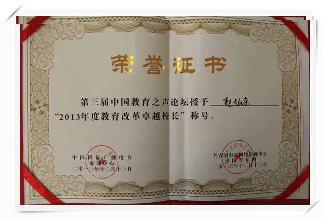 由中國(guó)國(guó)際廣播電臺(tái)新聞中心、共青團(tuán)中央網(wǎng)絡(luò)影視中心、中國(guó)青年網(wǎng)、中國(guó)教育之聲網(wǎng)聯(lián)合主辦,清華大學(xué)教育研究院、北京市朝陽(yáng)區(qū)教育委員會(huì)協(xié)辦的“第三屆中國(guó)教育之聲論壇暨教育改革家年度盛典”授予我校趙燦東校長(zhǎng)“教育改革卓越校長(zhǎng)”稱號(hào)。