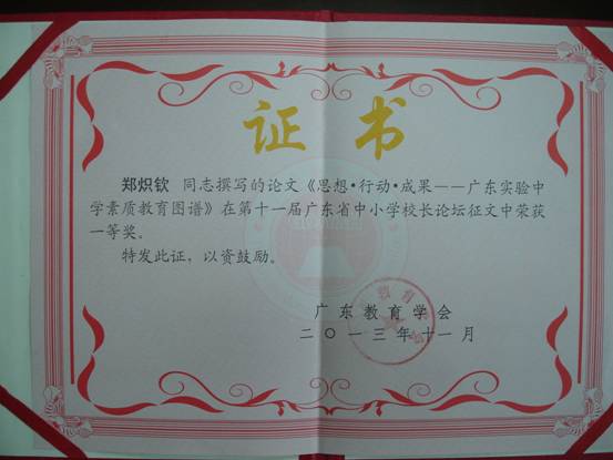 近日,在由廣東教育學(xué)會(huì)組織的第十一屆廣東省中小學(xué)校長論壇征文活動(dòng)中,我校鄭熾欽校長撰寫的《思想·行動(dòng)·成果——廣東實(shí)驗(yàn)中學(xué)素質(zhì)教育圖譜》榮獲一等獎(jiǎng)。