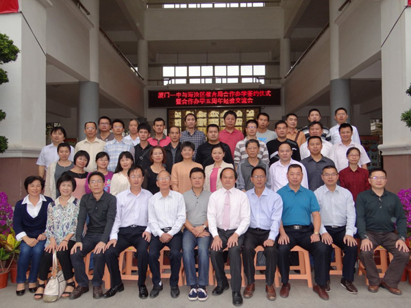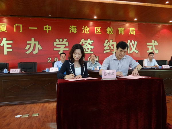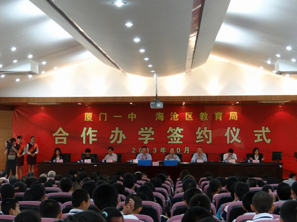 廈門一中發(fā)展歷程中的又一個歷史性時刻,廈門一中與海滄區(qū)教育局續(xù)簽合作辦學(xué)儀式于2013年10月30日上午在廈門一中海滄分校隆重舉行,廈門一中與海滄區(qū)教育局在經(jīng)過五年愉快合作,取得輝煌成就之后,繼續(xù)攜手合作發(fā)展海滄教育。參加儀式的有市教育黨工委副書記郭慶俊、海滄區(qū)宣傳部部長張谷、市教育局副局長任勇、廈門一中校長周君力、海滄區(qū)人大副主任王明德、海滄區(qū)政協(xié)副主席葉莎莉、海滄區(qū)教育局局長陸曉紅等領(lǐng)導(dǎo),廈門一中各分校領(lǐng)導(dǎo)老師和海滄分校師生400余人一同見證了這一歷史性時刻。