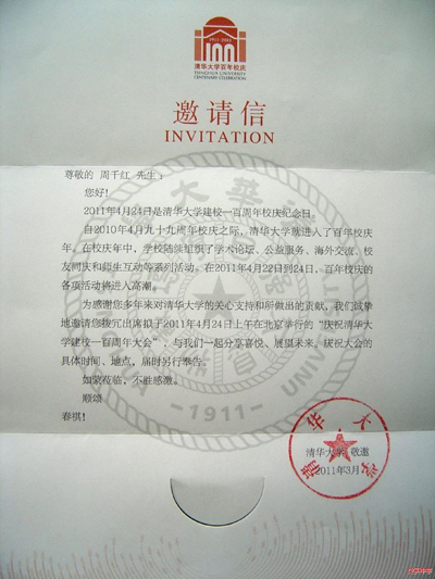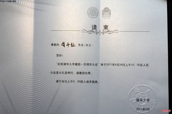受清華大學(xué)的邀請,周千紅校長出席了清華大學(xué)百年校慶活動。2011年4月24日上午10:00,參加了在人民大會堂舉行的“慶祝清華大學(xué)建校一百周年大會”。中午,在人民大會堂宴會廳,清華大學(xué)校長顧秉林院士宴請了受邀的各位中外高校及中學(xué)校長。
