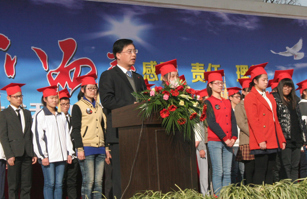 校長朱國璋在儀式上熱情致辭。朱校長向同學(xué)們送上了最美好的祝福,希望同學(xué)們胸懷夢想、學(xué)會(huì)感恩、勇于擔(dān)當(dāng),要對自己負(fù)責(zé),更要對國家、對社會(huì)、對生活負(fù)責(zé),為中國夢的實(shí)現(xiàn)、為國家發(fā)展和社會(huì)進(jìn)步做出自己應(yīng)有的貢獻(xiàn)。最后,朱校長勉勵(lì)同學(xué)們以良好的心態(tài)、堅(jiān)韌的毅力,全力以赴,完成人生第一大考——高考,送自己一個(gè)最壯美的成人禮。