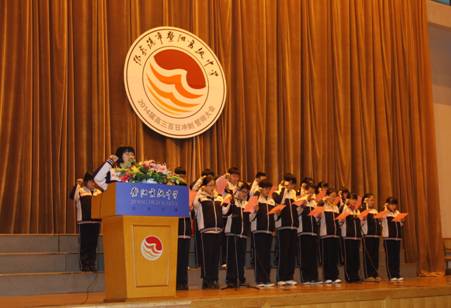 會(huì)議的第三個(gè)議程為師生宣誓。全體高三老師和學(xué)生分別在年級(jí)部主任陳利清和學(xué)生代表周嘉玥的帶領(lǐng)下進(jìn)行了莊嚴(yán)的宣誓,一句句鏗鏘的誓言表現(xiàn)了暨陽人必勝的信心,一聲聲激情的吶喊張揚(yáng)了暨陽人強(qiáng)者的風(fēng)范,此起彼伏的誓語久久回蕩在全體與會(huì)者的心中。