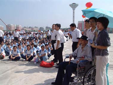 住院數(shù)月,年已93高齡的老校長(zhǎng)傅衍祥,手背貼著遮蓋輸液針眼膠布,坐著輪椅趕到慶典現(xiàn)場(chǎng)