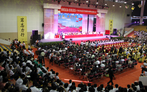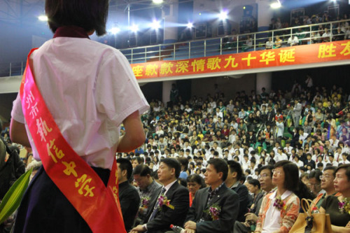 周年慶典。干凈整潔、煥然一新的校園內(nèi),燈籠高懸,彩旗飄揚(yáng),近千盆鮮花爭(zhēng)芳吐艷,近百面彩旗和數(shù)條大彩球牽動(dòng)著直幅標(biāo)語凌空飛舞,五顏六色的祝賀條幅或從辦公樓、體育館外墻頂披掛而下,或從運(yùn)動(dòng)場(chǎng)上冉冉升空,將高大的建筑映襯得亮麗壯觀,巍巍學(xué)府一改往日的素顏,披上了節(jié)日的盛裝,處處洋溢著歡樂祥和的喜慶氣氛。執(zhí)信校園里到處是沸騰的人群,到處是激情的話語!