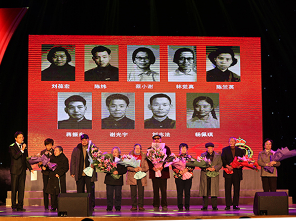 上外附中建校初期的九位老領(lǐng)導(dǎo)、老教師登臺接受少先隊員鮮花