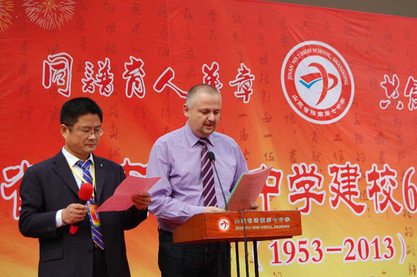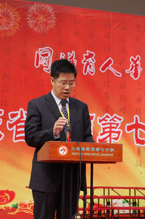 9點30分,慶典大會在嘹亮的國歌聲中拉開帷幕。首先,濟南七中校長蘆文武發(fā)表致辭;隨后濟南市教育局黨委副書記王春光發(fā)表講話,對我校六十年發(fā)展歷程中的工作與貢獻做出肯定,并對我校未來發(fā)展予以誠摯的祝福;作為我校國際教育交流合作的姊妹學(xué)校,日本和歌山縣立橋本高等學(xué)校、捷克奧藤文法學(xué)校也派代表專程趕來參加慶祝大會并發(fā)表講話祝賀我校六十華誕。