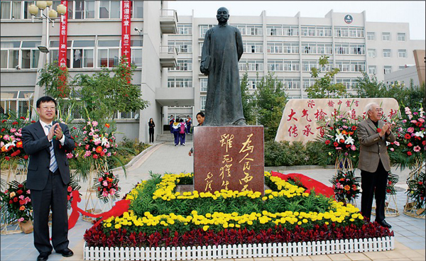 上午8點整,斌丞廣場上舉行了杜斌丞銅像揭幕暨獎學金頒發(fā)儀式。杜斌丞(1888年—1947年)原名丕功,字斌丞,自署秉誠。陜西米脂人,是一位偉大的愛國者、卓越的教育家和民主運動活動家,中國民主同盟西北組織的創(chuàng)始人。1918年至1927年在榆林中學擔任校長。他任職期間支持學生愛國運動,鼓勵學生為國效力,發(fā)展地方教育,開創(chuàng)了陜北教育的新局面,為馬克思主義和“五四”新文化在陜北的傳播開辟了道路。他一生不斷堅持革命,毛澤東曾稱贊他是“中國共產(chǎn)黨的忠實朋友”。周恩來評價他是“魯迅式的共產(chǎn)黨員”。有人說,杜斌丞之于榆中,就好像蔡元培之于北大,是一座豐碑、一種精神、一部教材,F(xiàn)在他的銅像靜靜矗立在斌丞廣場邊,激勵著一代又一代的榆中學子,奮發(fā)向上,開拓進取,追求卓越。