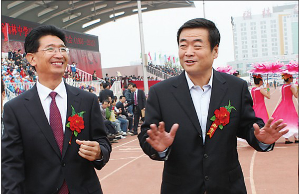 10點整,校慶大會準時在田徑場開始,會上宣讀了部分賀信、賀電,為捐贈單位頒發(fā)了牌匾和榮譽證書,并為省級示范高中揭牌。