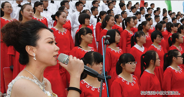 慶典結(jié)束后,精彩的廣場文藝演出大大渲染了全場的氣氛。文藝演出以高二年級學生表演的《桃李芬芳》作為開場舞蹈,合唱《旗幟頌》和《榆林中學校歌》更是引起了不少老校友的共鳴。58級的王振權(quán)激動地說:“我們念書那陣兒,榆中還沒有校歌,現(xiàn)在這個校歌好聽、積極向上,我也想把它學會!庇芰重斝1硌莸奈璧浮睹饭莿︿h》更是將場上的氣氛推向高潮。“這個節(jié)目好,不僅是舞蹈,還帶著點兒雜技,不比電視里的差!苯衲60多歲的白拖考說。整個文藝演出在秧歌《歡天喜地鬧榆中》中落下帷幕。