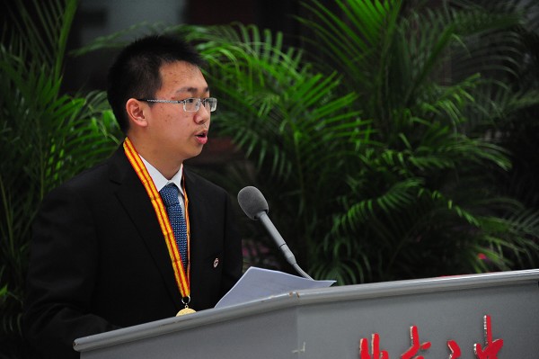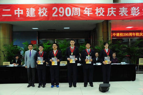大會(huì)由學(xué)生處冀紅杰主任主持,許柬副校長宣讀了學(xué)校對(duì)2014年度金銀質(zhì)獎(jiǎng)?wù)碌谋碚脹Q定,鈕校長等學(xué)校領(lǐng)導(dǎo)為獲獎(jiǎng)同學(xué)頒發(fā)了獎(jiǎng)?wù)、證書和勵(lì)勤獎(jiǎng)學(xué)金。表彰大會(huì)共設(shè)金銀質(zhì)獎(jiǎng)?wù)、科技競賽?jiǎng)、感動(dòng)二中優(yōu)秀學(xué)生及集體獎(jiǎng)、最具特色二中人獎(jiǎng)、進(jìn)校廣播創(chuàng)作獎(jiǎng)五種獎(jiǎng)項(xiàng)。其中,李芃芃、陜思宇等52名同學(xué)獲得金銀質(zhì)獎(jiǎng)?wù)录皠?lì)勤獎(jiǎng)學(xué)金;劉旺宇、張博雅、李自然、趙子翟、董思博等同學(xué)堅(jiān)持科技鉆研,在第三十四屆北京科技創(chuàng)新大賽取得一等獎(jiǎng)的優(yōu)異成績,彭博同學(xué)獲第十二屆北京青少年科技創(chuàng)新市長獎(jiǎng)的榮譽(yù)稱號(hào);國際部高二(1)班肖劍橋同學(xué)充分發(fā)揮自身特長幫助他人、回報(bào)社會(huì),兩年來堅(jiān)持志愿服務(wù),在公交車站中英文指路,在民航博物館做義務(wù)講解員,踐行著奉獻(xiàn)、友愛、互助、進(jìn)步的志愿精神,獲得了感動(dòng)二中優(yōu)秀學(xué)生稱號(hào);高三(2)班三年來秉承自律、團(tuán)結(jié)、責(zé)任、堅(jiān)持的班級(jí)精神,創(chuàng)造了三年來摘取全部三十八面衛(wèi)生紅旗的優(yōu)良衛(wèi)生記錄,獲得感動(dòng)二中先進(jìn)集體稱號(hào)。會(huì)上,彭博、肖劍橋等部分獲獎(jiǎng)學(xué)生代表做了精彩發(fā)言,與同學(xué)們分享了他們的學(xué)習(xí)生活感受,他們的動(dòng)人事跡充分詮釋了踏實(shí)、執(zhí)著、奉獻(xiàn)等優(yōu)秀品格,深深地感動(dòng)了在場全體同學(xué),發(fā)揮了良好的榜樣作用。特別值得注意的是,為更好地傳承國學(xué)文化精髓,踐行二中自由篤行的文化傳統(tǒng),為各方面堅(jiān)持不懈、學(xué)有所長的同學(xué)搭建成長的平臺(tái),學(xué)校在本次表彰中特地增設(shè)"最具特色二中人獎(jiǎng)",共分"厚德友愛"、"博學(xué)雅聞"、"格物致知"、"怡情養(yǎng)性"四項(xiàng),今年共有799名學(xué)生獲獎(jiǎng),占學(xué)校學(xué)生總數(shù)的53%,表現(xiàn)出學(xué)校鼓勵(lì)學(xué)生全面發(fā)展、不斷進(jìn)步的巨大魄力,將會(huì)場氣氛推向了高潮。表彰大會(huì)結(jié)束后,各年級(jí)選送優(yōu)秀節(jié)目進(jìn)行了展演,同學(xué)們用精彩的文藝演出向母校二百九十周年華誕獻(xiàn)上了自己的賀禮,表達(dá)了對(duì)學(xué)校悠久歷史的懷念,對(duì)學(xué)校輝煌未來的祝福。