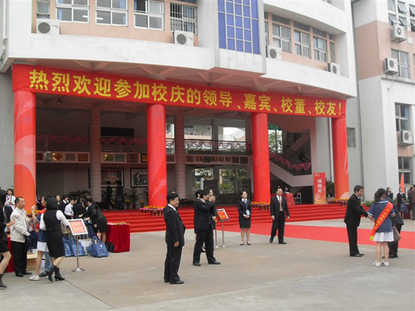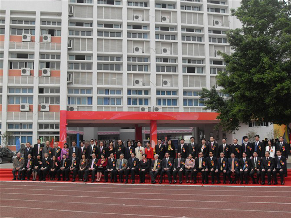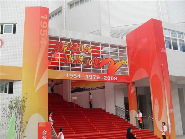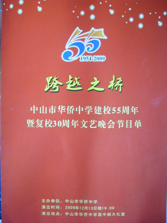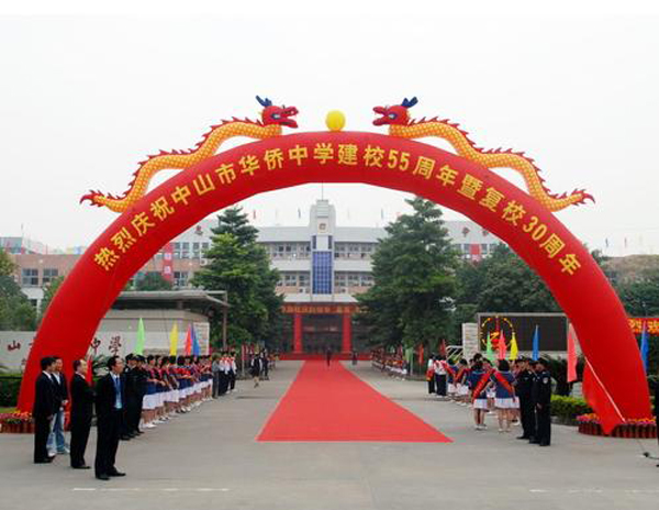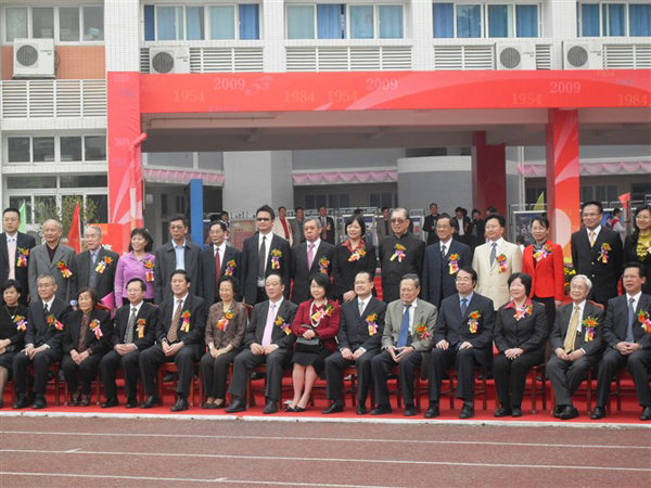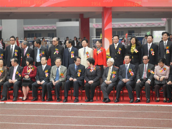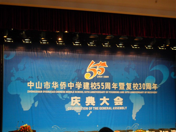 金菊溢彩,丹桂飄香,2009年12月14日,中山市華僑中學(xué)迎來(lái)了建校55周年暨復(fù)校30周年的大喜日子。高中部校園內(nèi),八面彩旗迎風(fēng)飄,四方賓朋展笑顏。大紅的地毯、高懸的氣球、五彩的鮮花、整齊的著裝,校園上下到處洋溢著喜慶而隆重的氛圍,向世人昭示著華僑中學(xué)55年一路走來(lái)的果敢與自信、光榮與輝煌。
