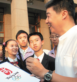 “這里是我夢開始的地方。”一個手捧2008年北京奧運會會徽展示圖的中年人說。他就是第一中學(xué)1975屆校友郭春寧,2008年北京奧運會會徽的主創(chuàng)者。