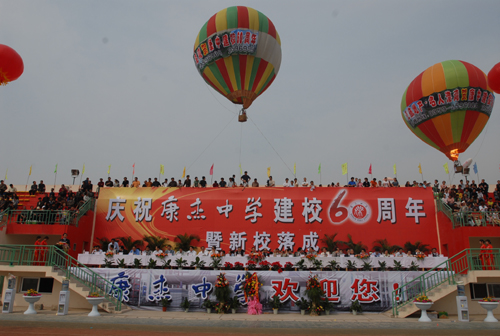 數(shù)百家恭賀單位的條幅掛滿了會場周圍的教學(xué)樓外墻,火紅的一片,在風(fēng)中翻滾,發(fā)出歡天喜地的啪啪聲;六個彩球在主席臺兩旁升起、搖曳;滑行傘帶著對學(xué)校六十華誕的祝福,在天空中盤旋;一架乳白色的漂亮的飛艇,載著對學(xué)校生日的問候,在和煦的晨光中歡呼。