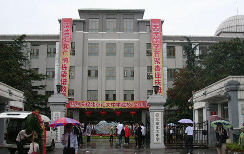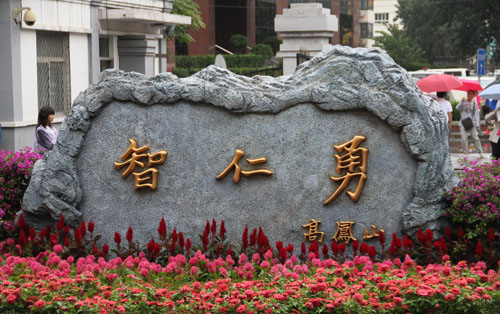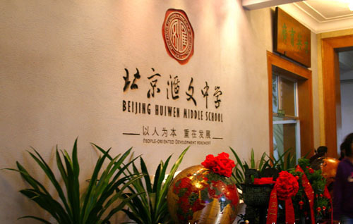 走進校門,就看到迎賓石上金燦燦的、蒼勁有力的幾個中英文大字“北京匯文中學”,背面是高鳳山的題字“智仁勇”,頗有一番文化韻味。迎賓石周圍是各色的鮮花,熱情的紅,嬌艷的粉,晶瑩的黃,浪漫的紫,百花綻放,芬芳怡人。