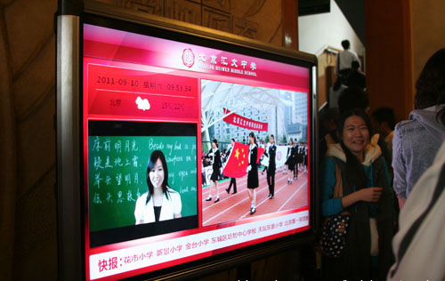 同步自主研發(fā)的綜合信息發(fā)布系統(tǒng)是集網絡視頻、電視接收、媒體播放、字幕新聞以及圖文信息為一體,提供基于“視覺展現(xiàn)”為目標的綜合信息發(fā)布解決方案。這次校慶活動主要應用了其多種媒體播放、動態(tài)頁面切換、拍照上屏功能。
