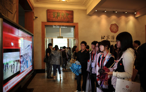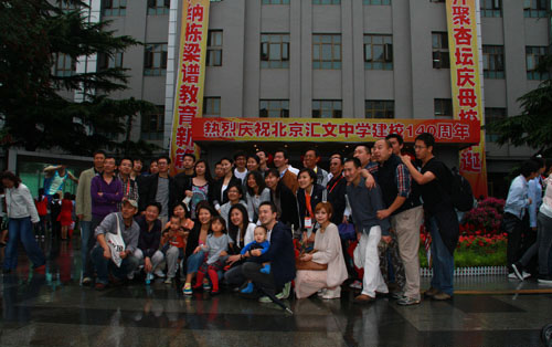 “莘莘學子齊聚杏壇慶母校華誕,浩浩匯文廣納棟梁譜教育新篇”正對校門的教學樓上這幅偌大的對聯(lián)分外醒目,橫聯(lián)是“熱烈慶祝北京匯文中學建校140周年”,校友們還沒進校門就開始留影了。學生志愿者迎著細雨,在校門口列隊歡迎,安排各屆校友簽到、領取紀念品、到簽名墻簽名、校友團聚等。