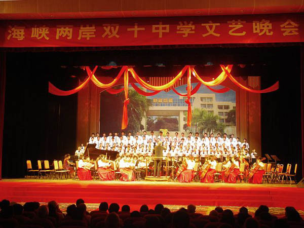 學(xué)校,因?yàn)椤半p十”而相識(shí),更因?yàn)閮砂短烊淮嬖诘那Ыz萬縷的聯(lián)系,越走越近。自從2006年兩校在第四屆世界合唱比賽開幕式上聯(lián)合演出,同唱一首歌后,音樂讓這兩所學(xué)校越走越近。今天,臺(tái)中雙十中學(xué)校長(zhǎng)莊煥綱帶領(lǐng)著近百人的團(tuán)隊(duì)跨海慶祝廈門雙十中學(xué)90歲生日。