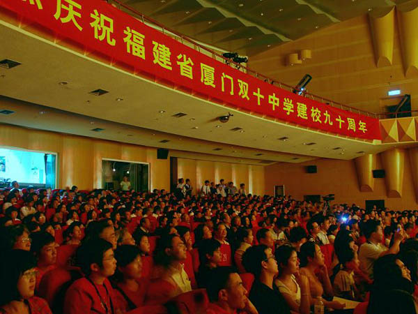 十日晚,掩映在中山公園綠樹叢中的廈門歌舞劇院高朋滿座,流光溢彩,眾多雙十校友齊聚一堂,參加“海峽兩岸雙十中學(xué)文藝晚會(huì)”,為母校九十周年華誕慶生。