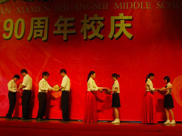 廈門雙十中學(xué)作為東道主,也為遠(yuǎn)道而來的客人獻(xiàn)上自己精彩的演出,把晚會(huì)推上一個(gè)又一個(gè)的高潮。這次活動(dòng)既是校慶,又是校園文化的充分展示,所以廈門雙十中學(xué)舞蹈隊(duì)就以校園生活為題材,表演了幾個(gè)精彩的節(jié)目。在溫馨的懷舊歌曲《童年》的樂聲中,同學(xué)們曼妙的舞姿,呈現(xiàn)了一個(gè)個(gè)童年記憶中的場(chǎng)景,讓觀眾重溫了一遍童年生活,許多白發(fā)蒼蒼的嘉賓,看的非常出神,儼然又回到了自己在雙十度過的那段難忘歲月。而另外幾個(gè)節(jié)目,諸如《少數(shù)民族舞曲》,多才多藝的洪婉婷、蔡藝等同學(xué)令人折服的演技,讓觀眾看到了雙十學(xué)子良好的素質(zhì)。